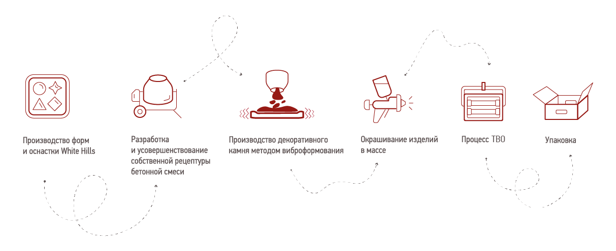 Производственная база White Hills — это высокотехнологичное оборудование и собственные лаборатории, позволяющие создавать изделия с высокой степенью точности и детализации. Ассортимент постоянно расширяется и на сегодняшний день включает более 600 наименований продукции, среди которых — фасадные и интерьерные решения различных форматов, фактур и цветовых гамм.